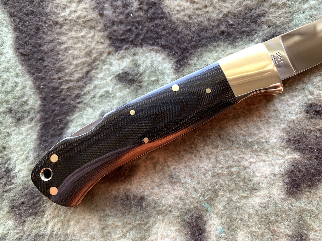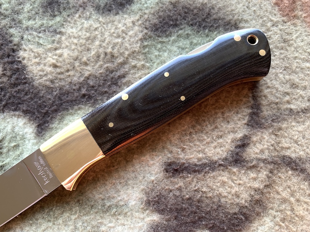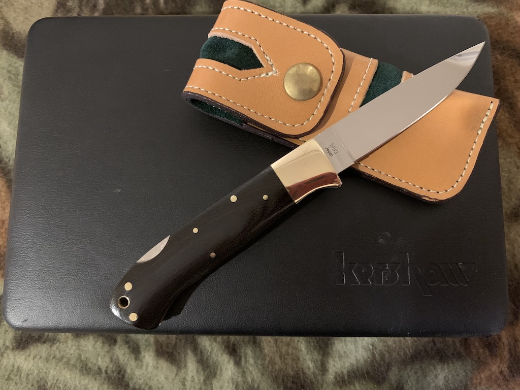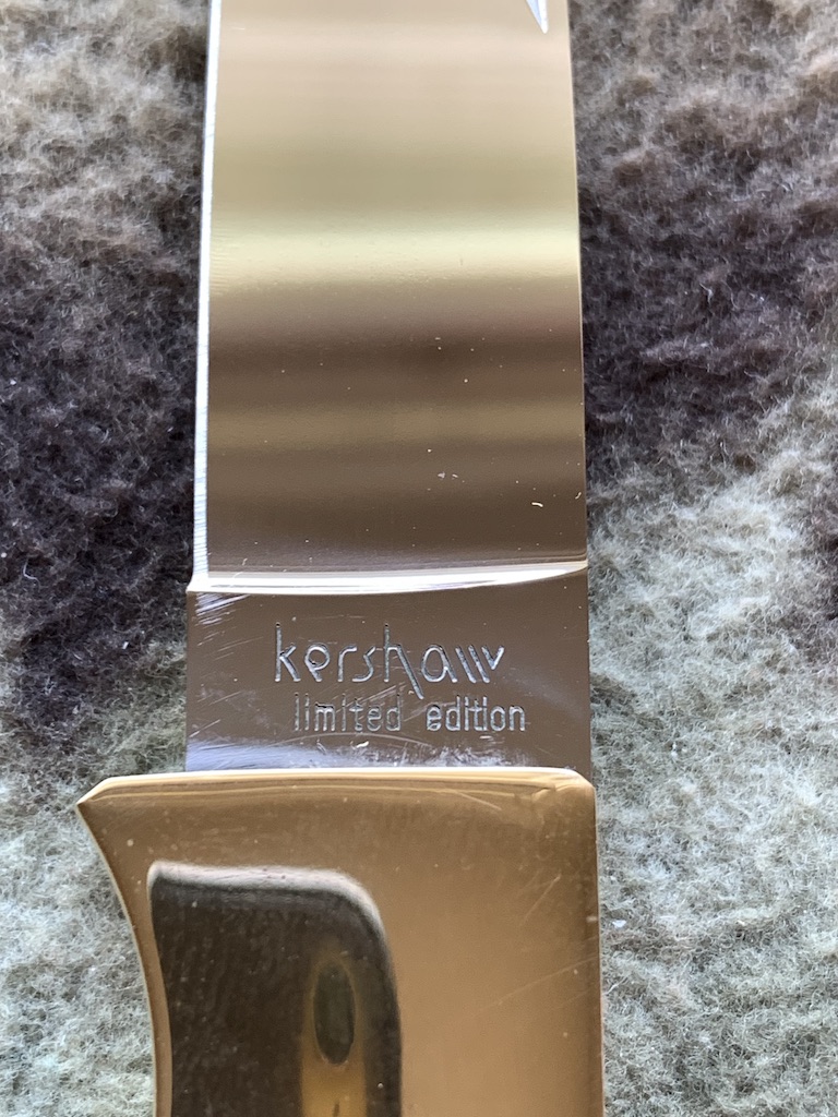 Black linen micarta handle scales accented by brass handle pins. Mirror Finished AUS 8 stainless steel blade with a razor sharp edge. Brass Bolsters and liners and lined lanyard hole. Includes a nice leather sheath. Old discontinued limited edition model by Kershaw. Very Nice, no signs of use.