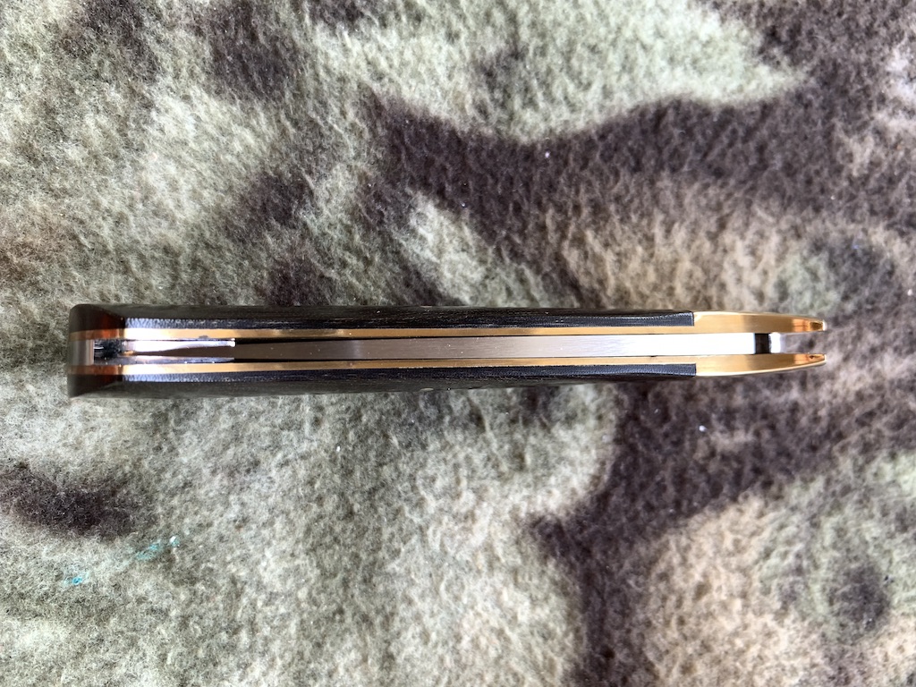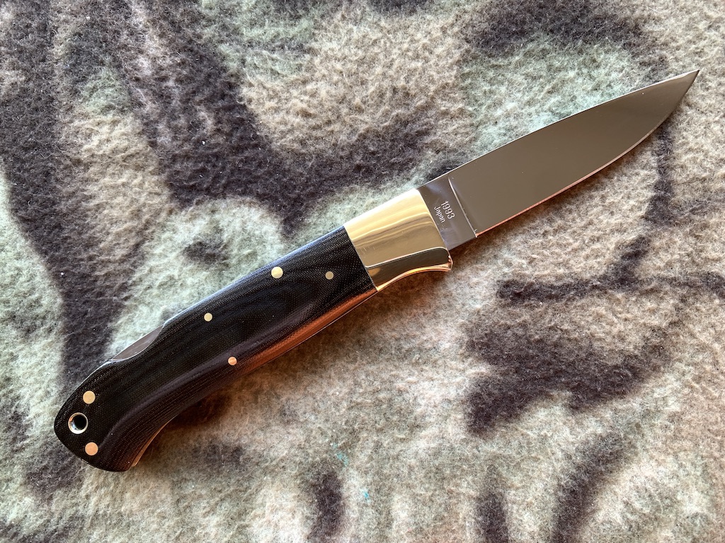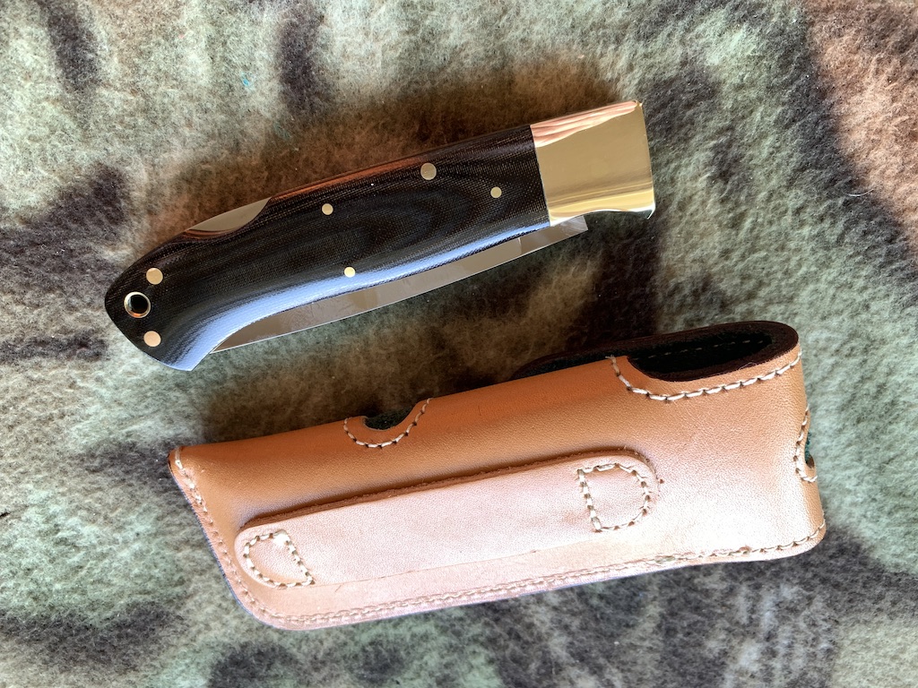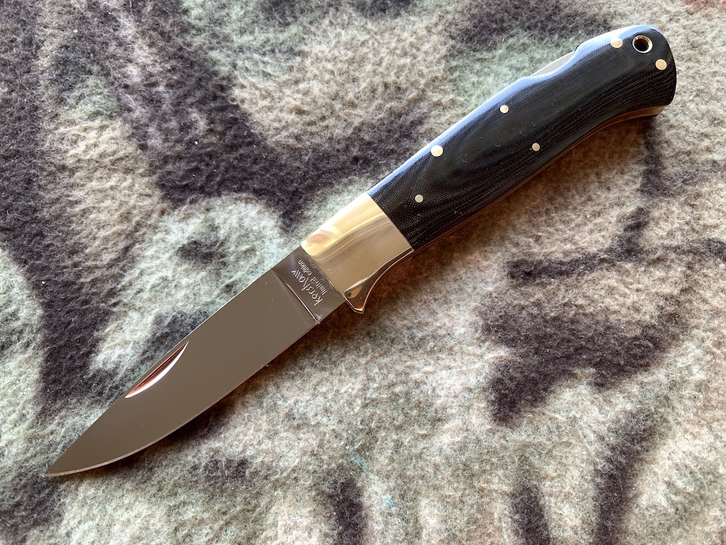 Black linen micarta handle scales accented by brass handle pins. Mirror Finished AUS 8 stainless steel blade with a razor sharp edge. Brass Bolsters and liners and lined lanyard hole. Includes a nice leather sheath. Old discontinued limited edition model by Kershaw. Very Nice, no signs of use.