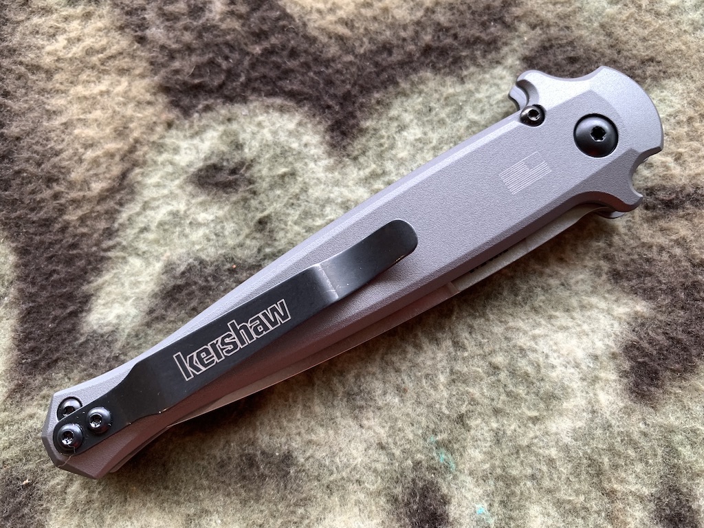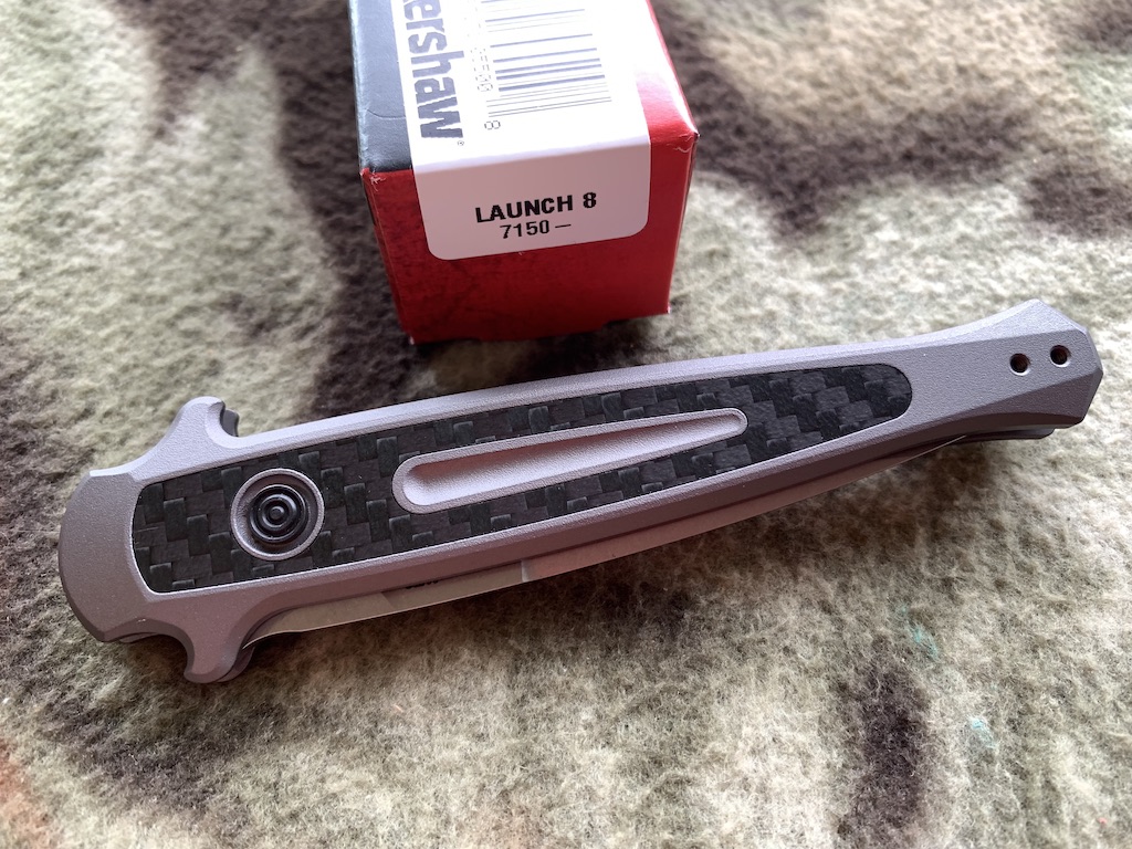The handle is gray anodized aluminum with a handsome carbon fiber insert. To maintain the Launch 8’s symmetrical look, the pivot is sunk deep in the handle and covered by the insert. Integrated fingerguards on both top and bottom of the handle keep fingers away from danger. The Launch 8 also has a reversible pocketclip (right/left, tip-up) for convenient carry.