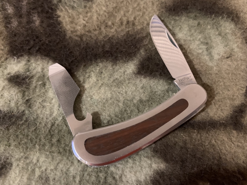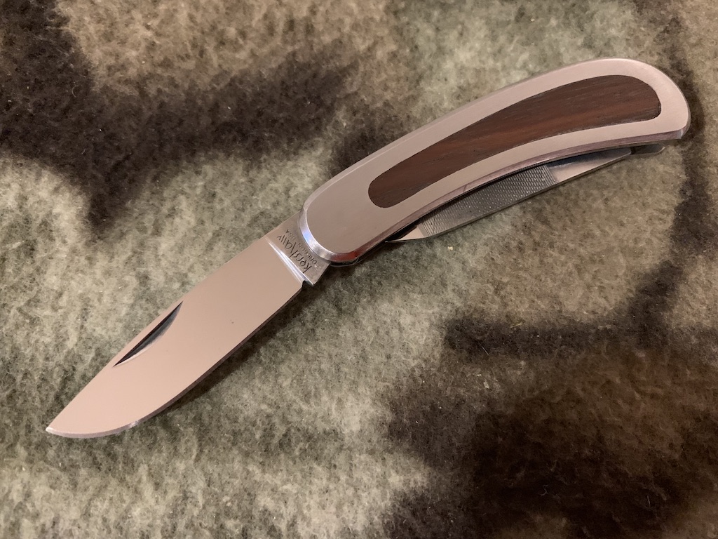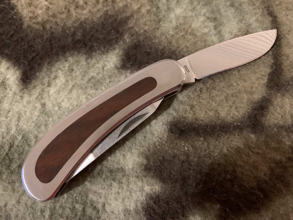 GOOD BUDDY MODEL 2001 1-5/8″ blade (4.1 cm); 1-5/8″ nail file/bottle opener/ screwdriver (4.1 cm). Closed 2-1/2″ long (6.4 cm). Wt.: 1-1/4 ozs. (35.4 g).